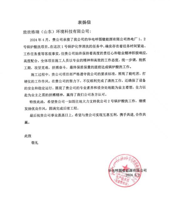 欣格瑞華電呼圖壁能源有限公司1#2#機(jī)組鍋爐化學(xué)清洗項(xiàng)目獲客戶(hù)表?yè)P(yáng)