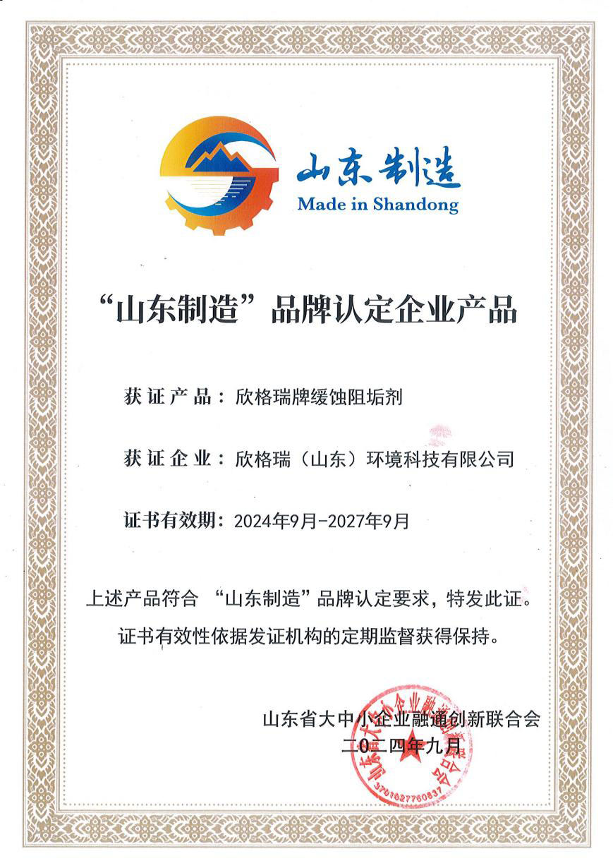 此次入選“山東制造”品牌認(rèn)定,不僅是對欣格瑞牌緩蝕阻垢劑產(chǎn)品質(zhì)量的肯定,更是對公司技術(shù)創(chuàng)新能力和市場競爭力的認(rèn)可。欣格瑞公司將以此為契機(jī),繼續(xù)加大研發(fā)投入,不斷提升產(chǎn)品質(zhì)量和技術(shù)水平,為客戶提供更加優(yōu)質(zhì)的水處理解決方案,為推動山東省制造業(yè)高質(zhì)量發(fā)展貢獻(xiàn)更多力量。