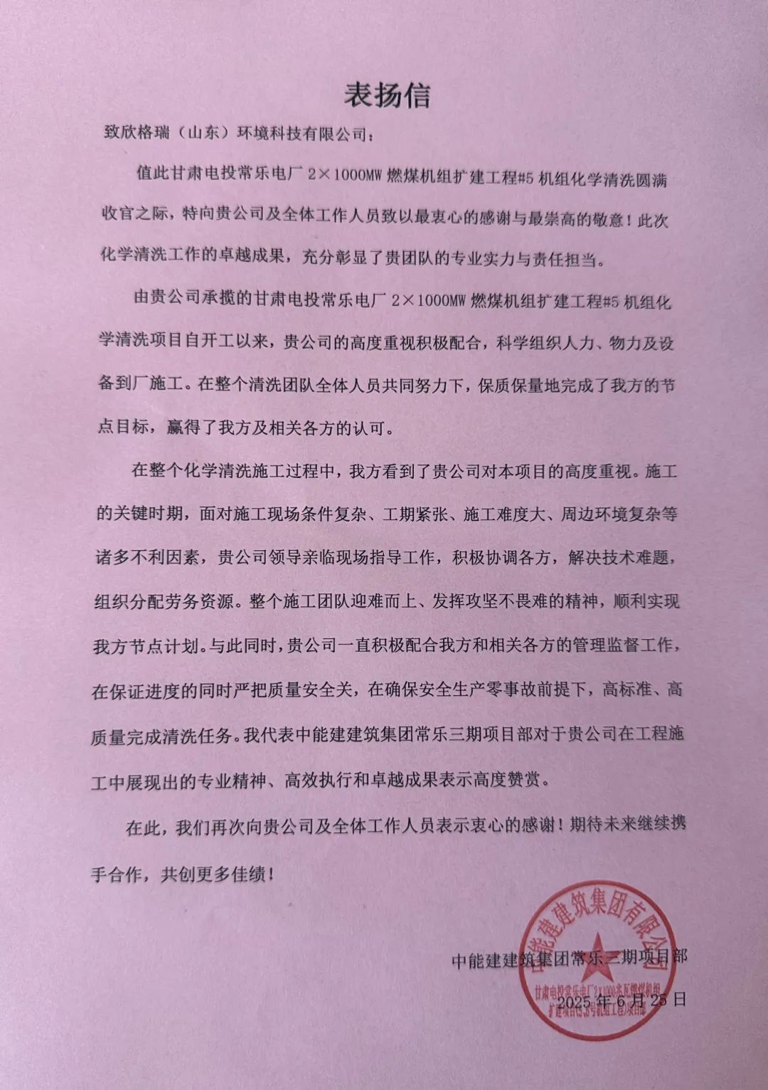 近日,欣格瑞公司收到來自中能建建筑集團(tuán)常樂三期項(xiàng)目部的表?yè)P(yáng)信。信中對(duì)欣格瑞在甘肅電投常樂電廠2×1000MW燃煤機(jī)組擴(kuò)建工程#5機(jī)組化學(xué)清洗項(xiàng)目中的卓越表現(xiàn)給予了高度評(píng)價(jià)。